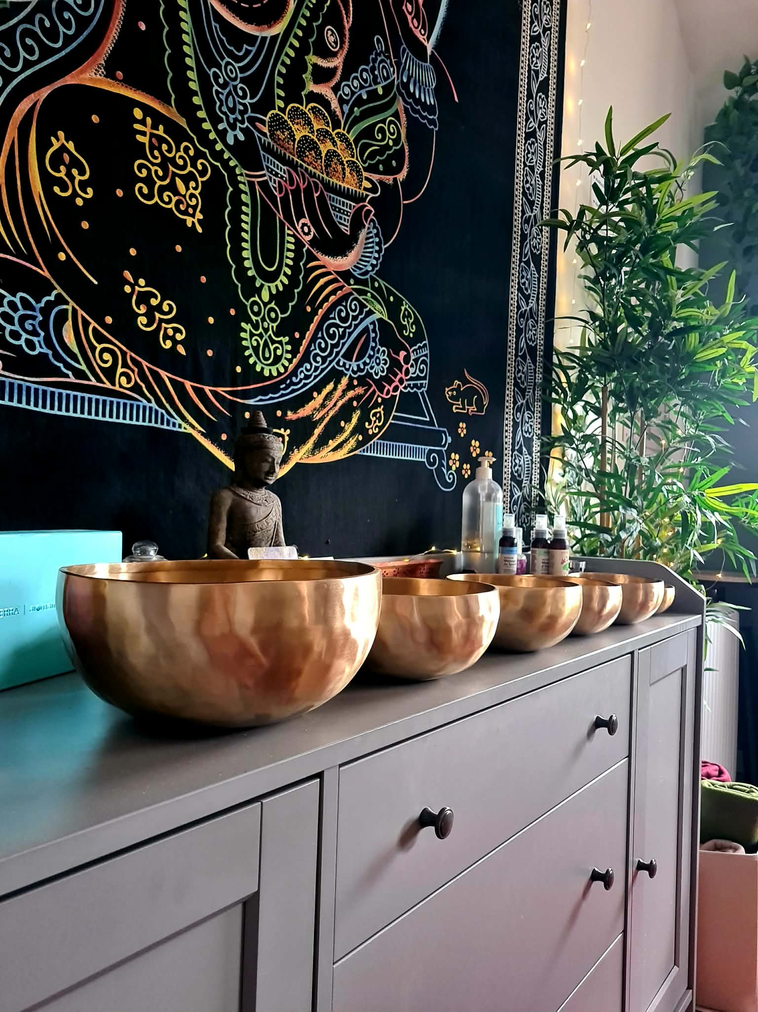 Pour le massage sonore, j’utilise 7 bols composés chacun de 7 métaux résonnant avec les 7 chakras (centres d’énergie) :